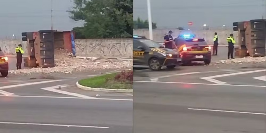 No vídeo, é possível observar o veículo tombado de lado, obstruindo parte da via, enquanto o material transportado estava espalhado pela pista. Essa cena surpreendente resultou em um congestionamento temporário, já que motoristas foram obrigados a reduzir a velocidade para contornar a situação.